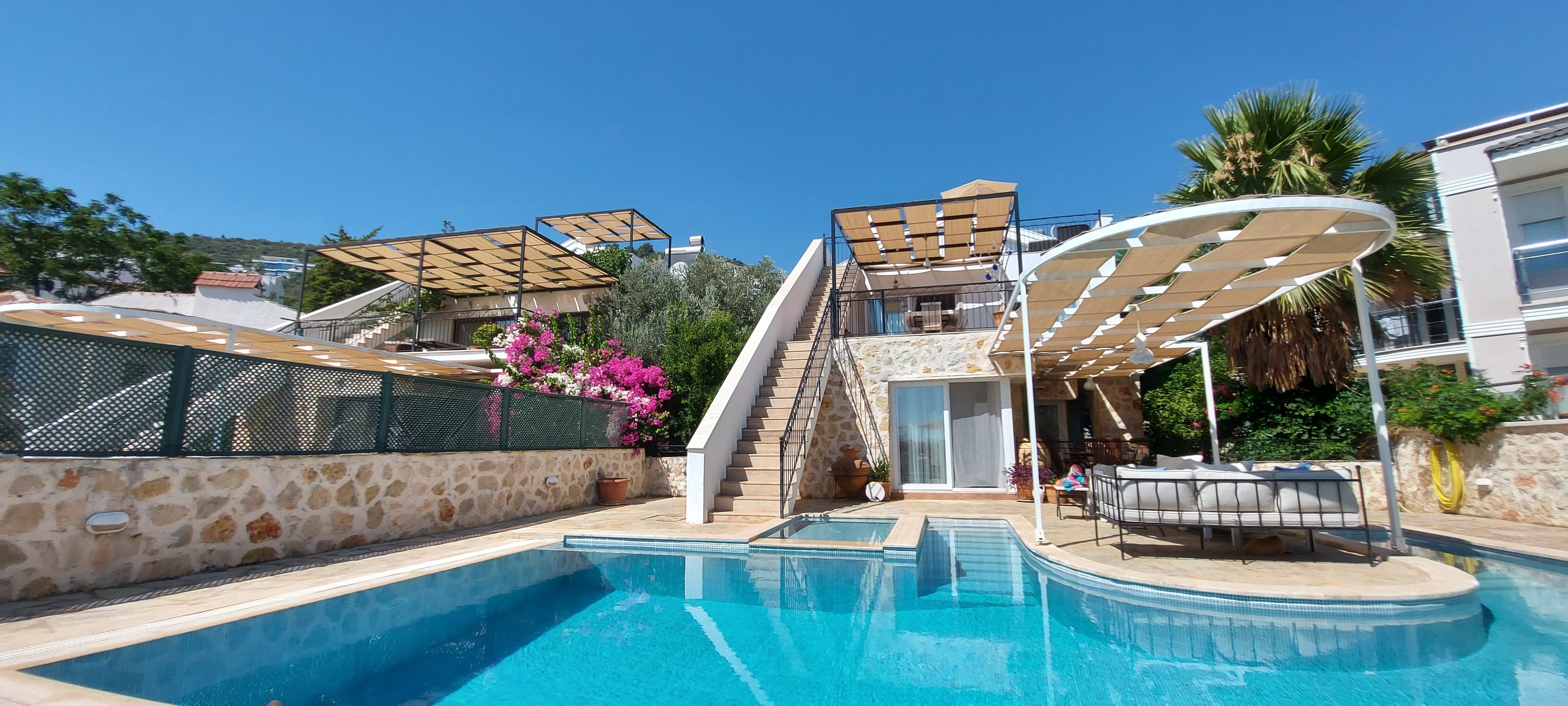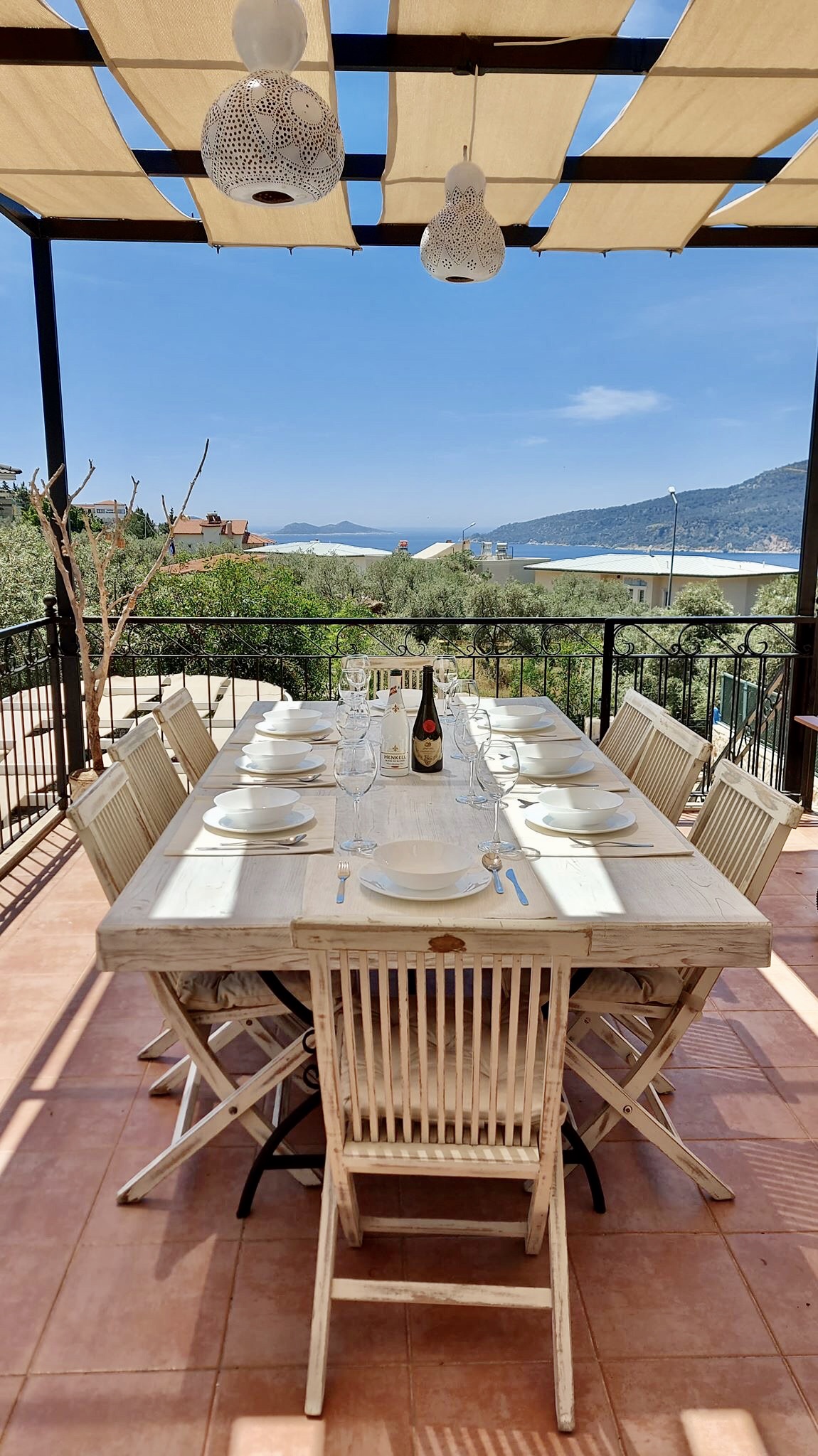 Outside is one of the largest private pools in Kalkan, the depth varies between 5 and 8 feet it is surrounded by ample sun beds, umbrellas and seating. The separate children's pool is shallow enough for even the smallest to paddle in. Pool towels are provided.